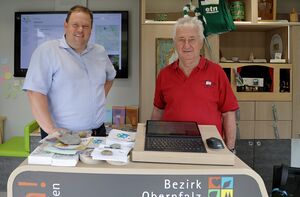 Tobias Appl (links) und Alois Köppl auf einem Infostand von OberpfalzWiki im Freilandmuseum Oberpfalz (2025) | |