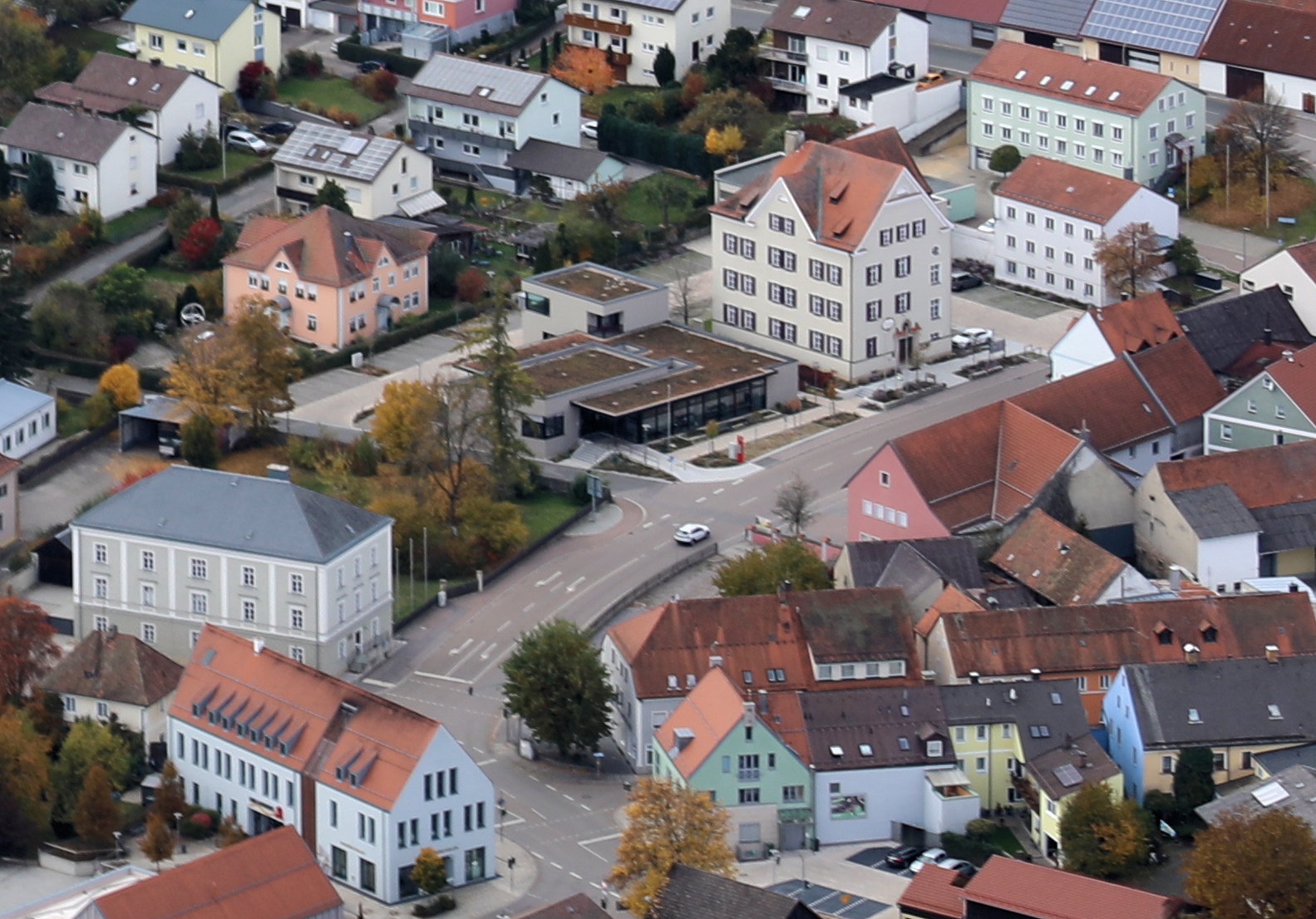 Neubau der Sparkasse Oberviechtach (Bildmitte), daneben rechts das Gebäude der Verwaltungsgemeinschaft Oberviechtach für die Gemeinden Gleiritsch, Niedermurach, Teunz und Winklarn: Oberviechtach, Landkreis Schwandorf, Oberpfalz, Bayern (18. Oktober 2025)