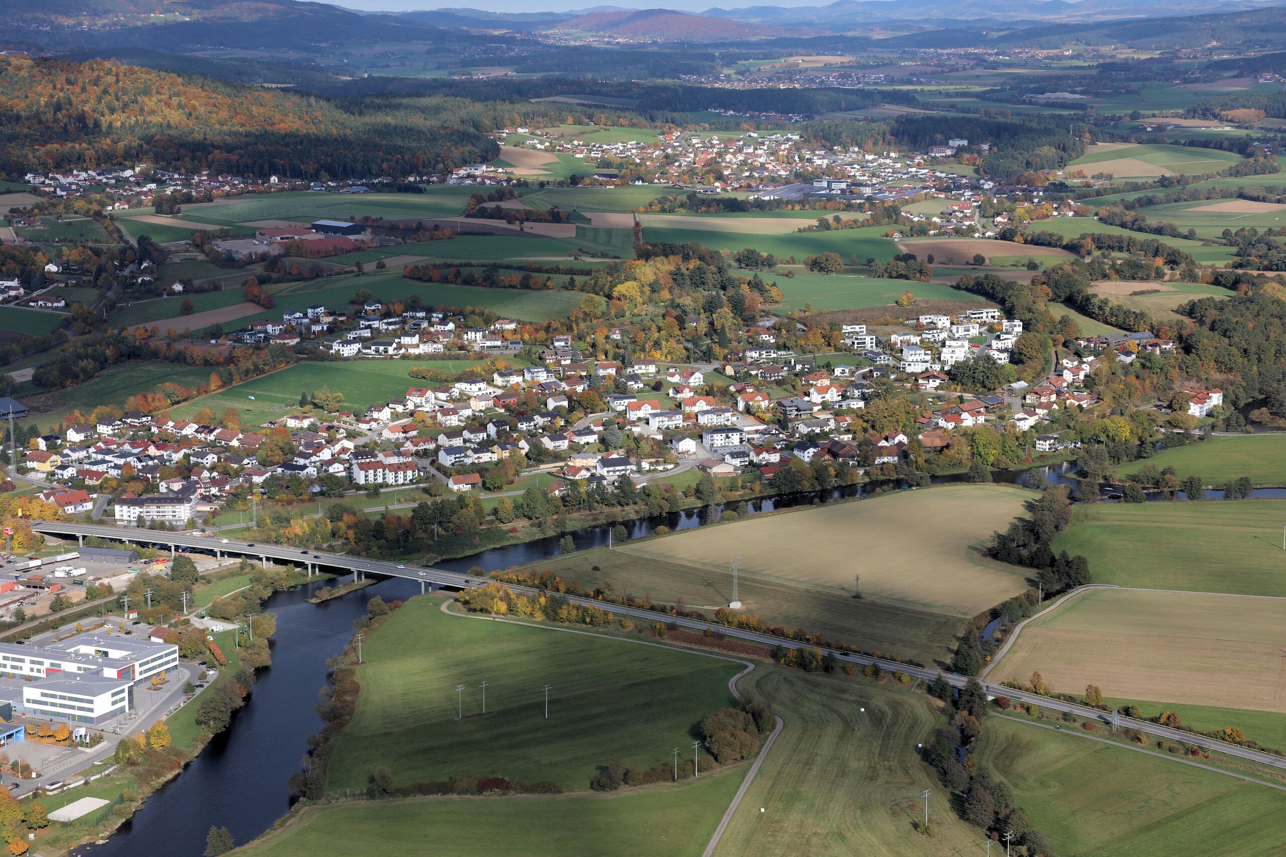 Stadtteil Altenstadt (Bildmitte), Stadtteil Siechen (Bildmitte links): Stadt Cham, Landkreis Cham, Oberpfalz, Bayern (18. Oktober 2025);