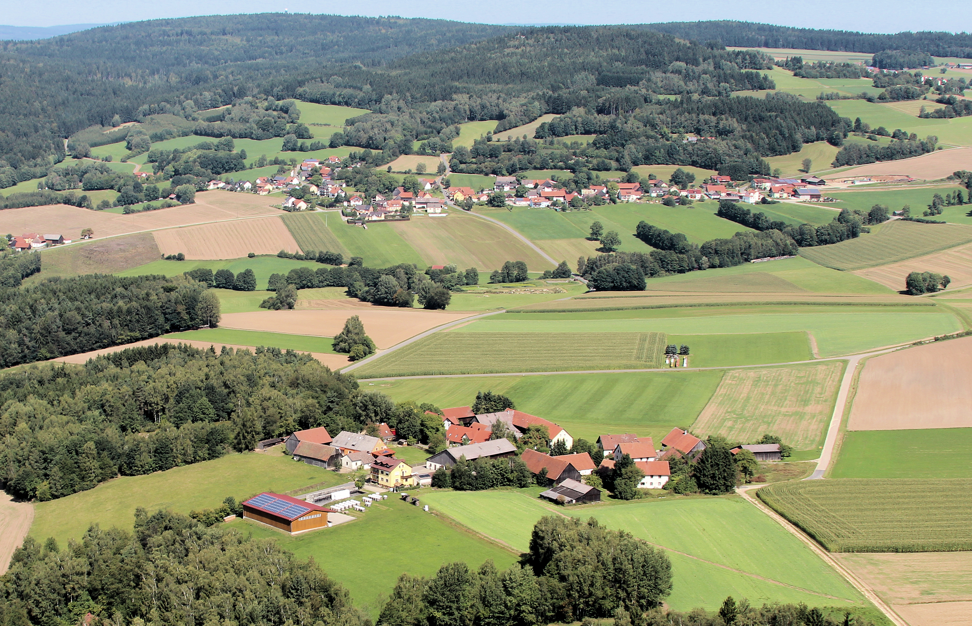 Burkhardsberg (Bildmitte unten), im Hintergrund Kühried: Gemeinde Teunz, Landkreis Schwandorf, Oberpfalz, Bayern (30. August 2017);