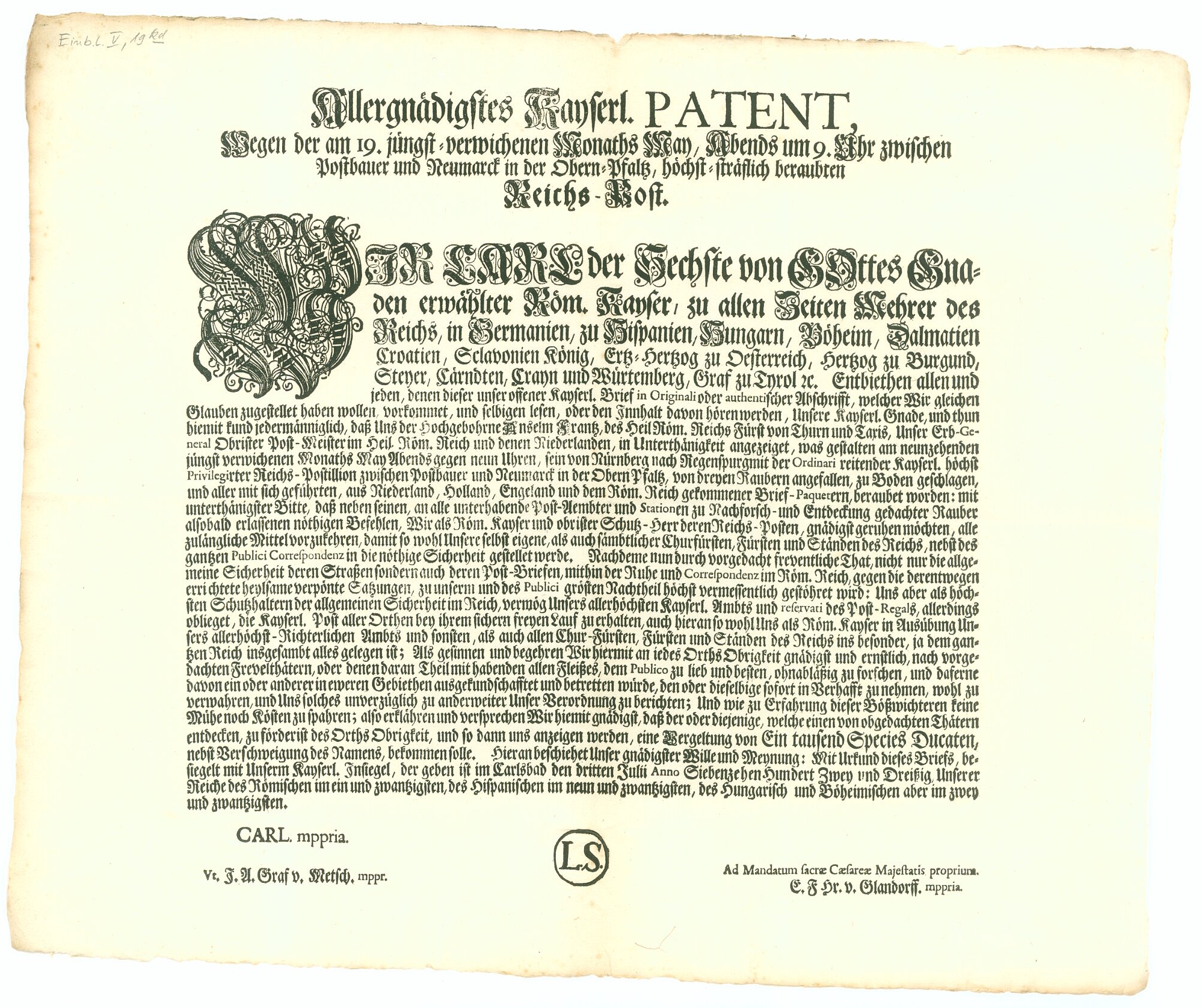 Einblattdruck - Fahndungsplakat - Postraub zwischen Postbauer und Neumarkt - 1732.