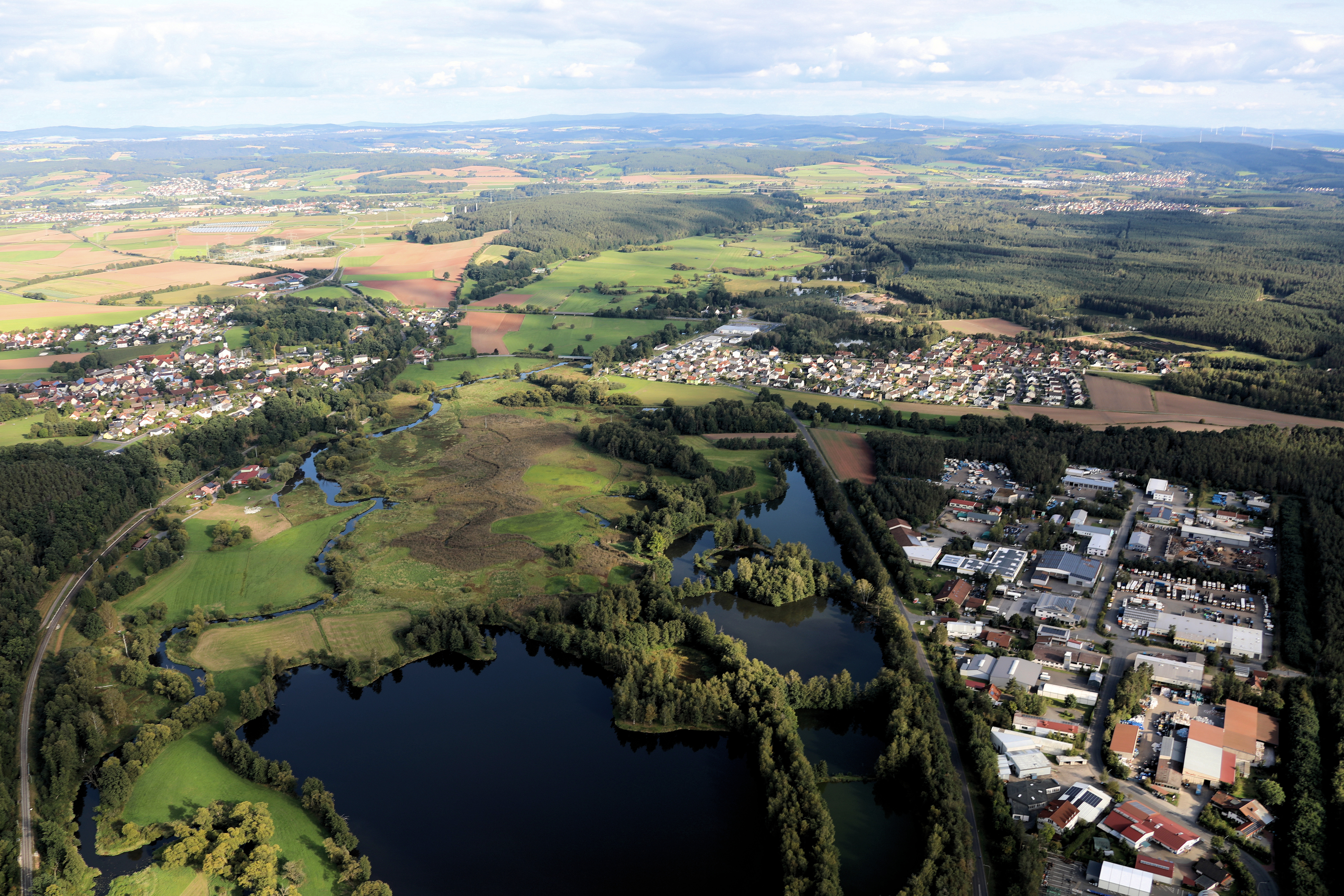 Etzenricht (links), Fluss Haidenaab, Radschin (Bildmitte): Gemeinde Etzenricht, Landkreis Neustadt an der Waldnaab, Oberpfalz, Bayern (18. Oktober 2025)