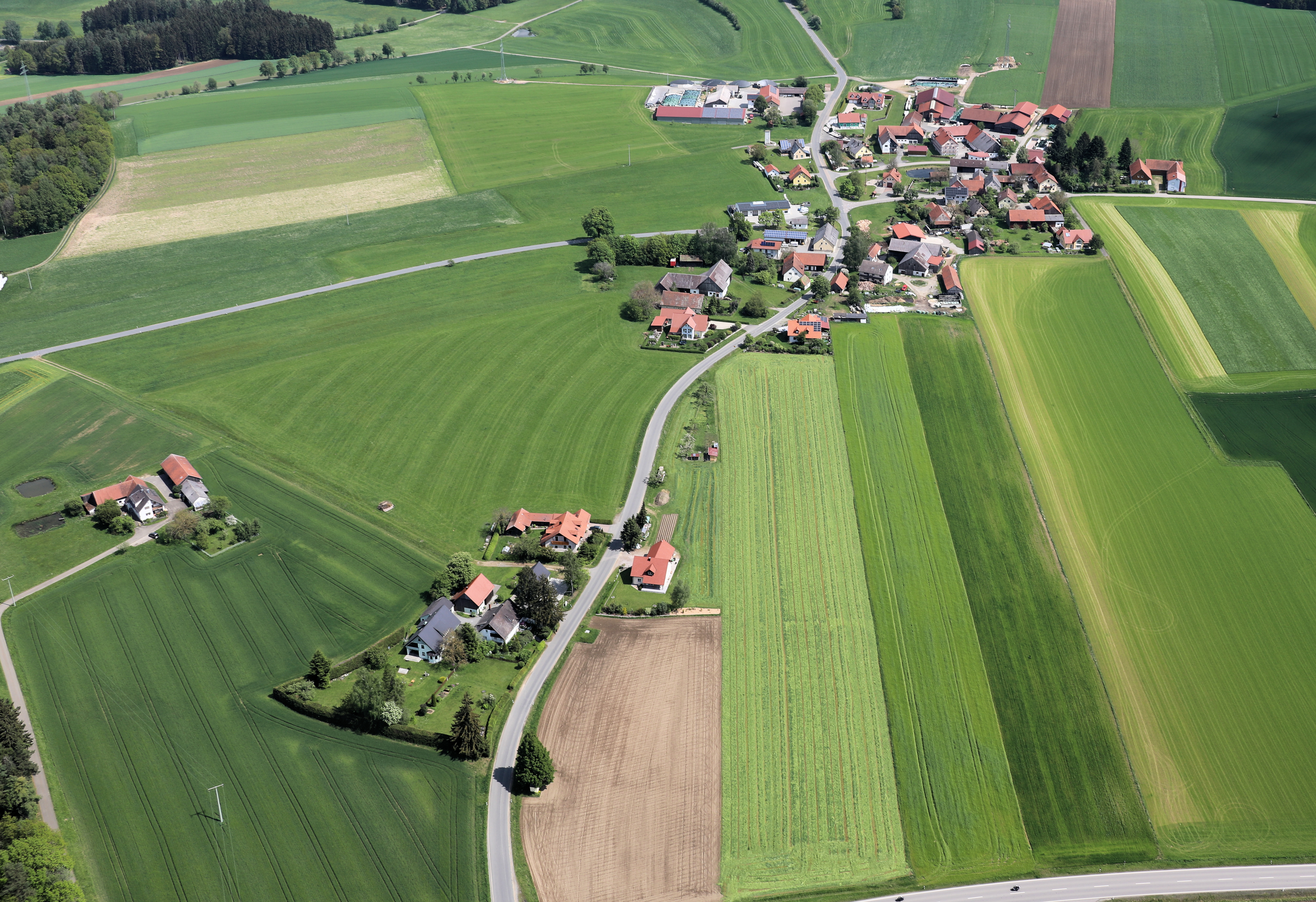 Forst (ein Teil der Streusiedlung unten), Nunzenried (oben): Stadt Oberviechtach, Landkreis Schwandorf, Oberpfalz, Bayern (9. Mai 2024);