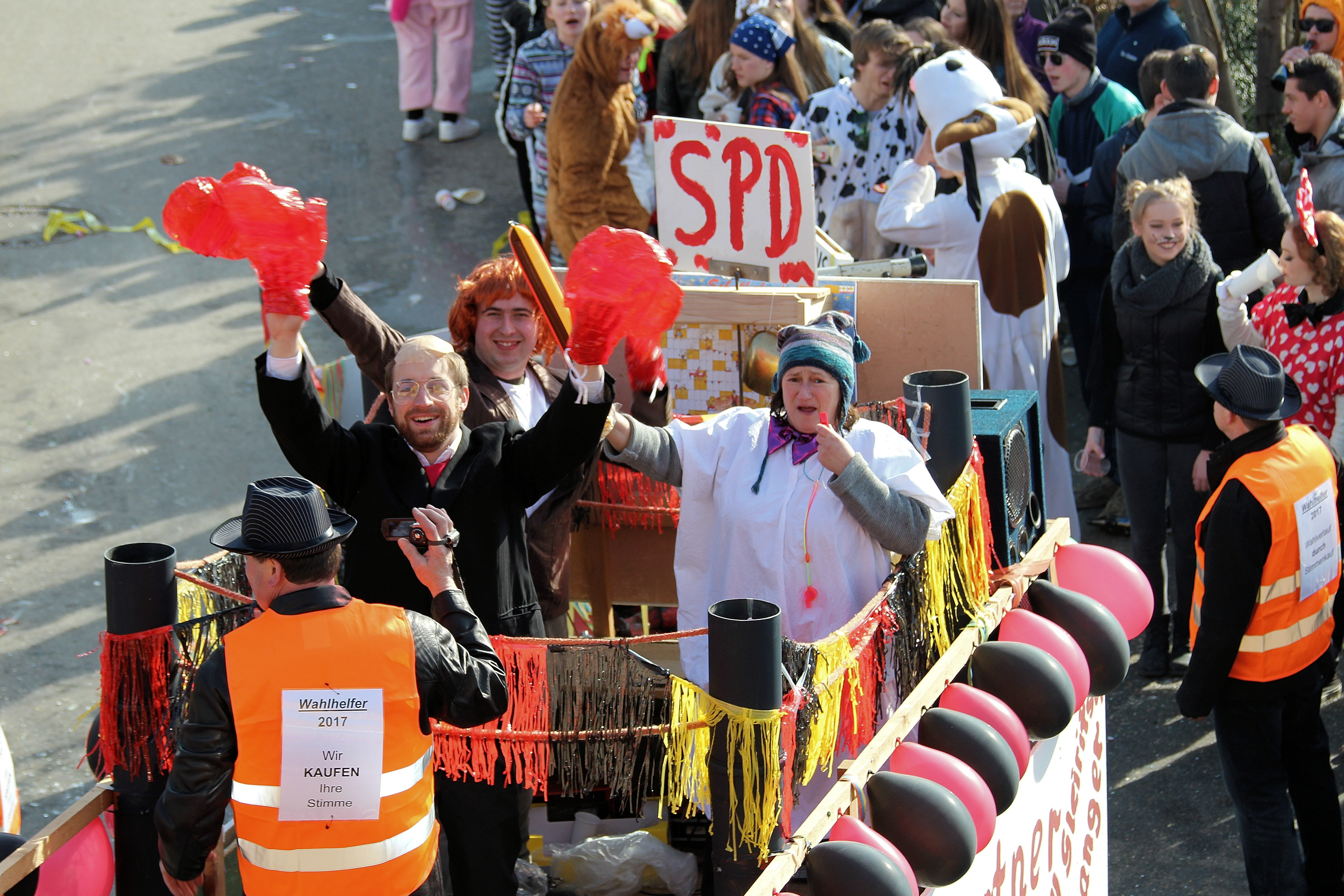 Freiwillige Feuerwehr Gleiritsch beim örtlichen Faschingszug mit MdB Marianne Schieder (rechts) auf dem Faschingswagen (25. Februar 2017).
