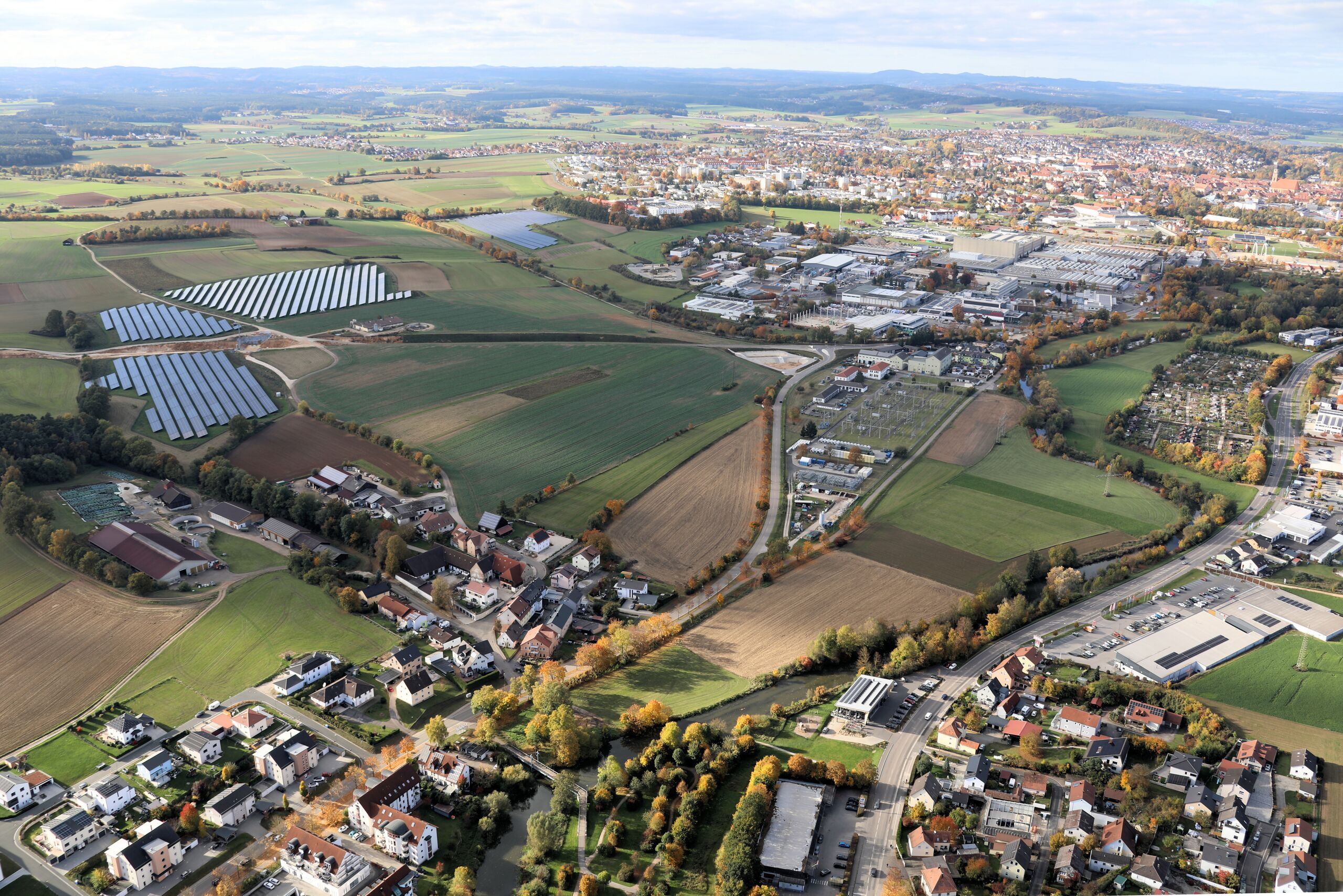 Haselmühl (links), im Hintergrund die Stadt Amberg: Haselmühl, Gemeinde Kümmersbruck, Landkreis Amberg-Sulzbach, Oberpfalz, Bayern (18. Oktober 2025)