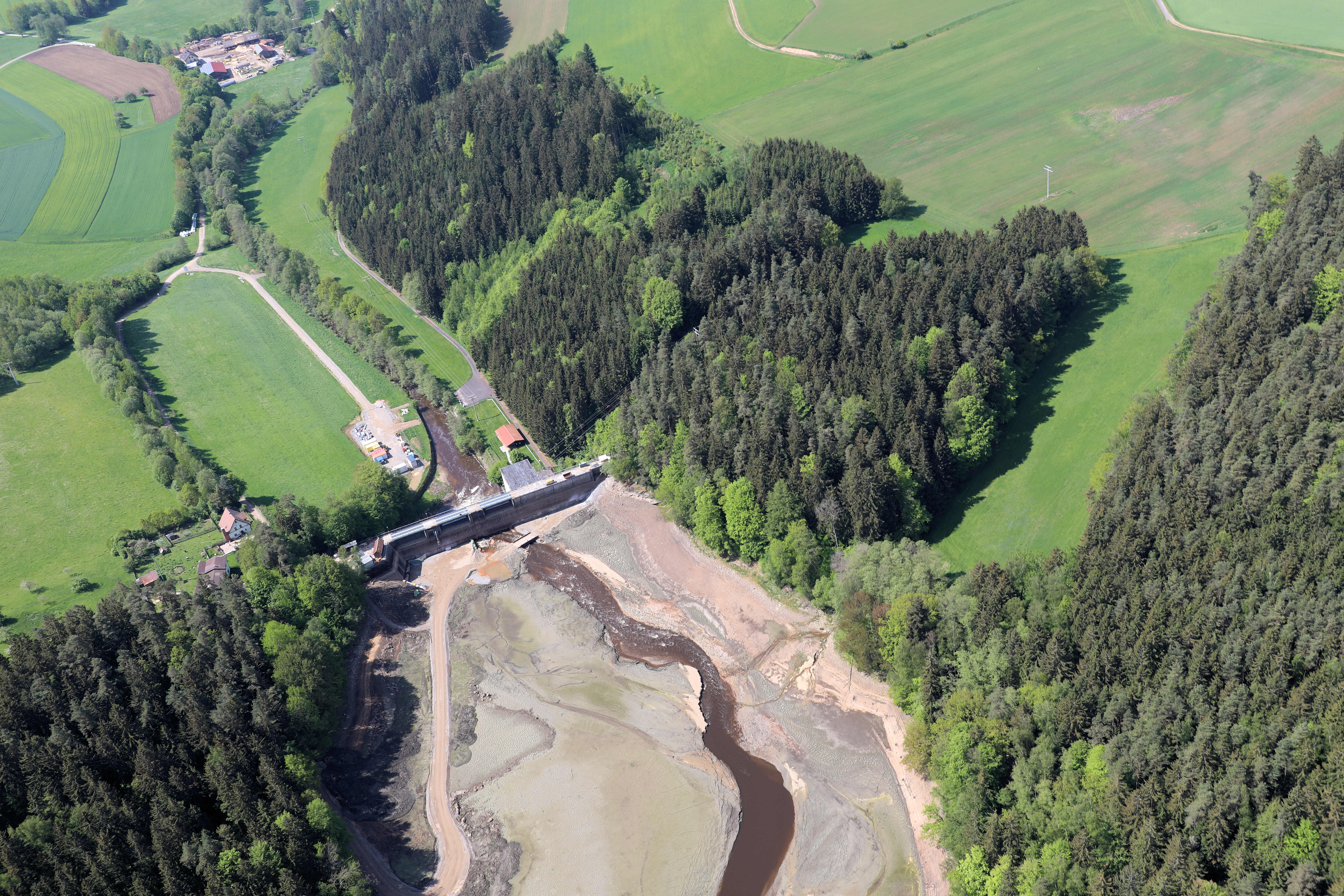 Kainzmühlsperre am Fluss Pfreimd, Sanierung der Staumauer, am oberen Bildrand die Kainzmühle: Markt Tännesberg, Landkreis Neustadt an der Waldnaab (2024);