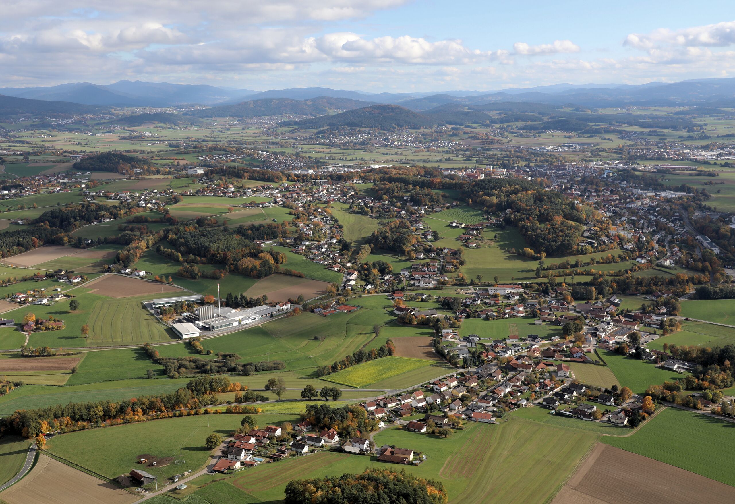 Katzbach (unterer Bildteil), Katzberg (Bildmitte): Stadt Cham, Landkreis Cham, Oberpfalz, Bayern (18. Oktober 2025);