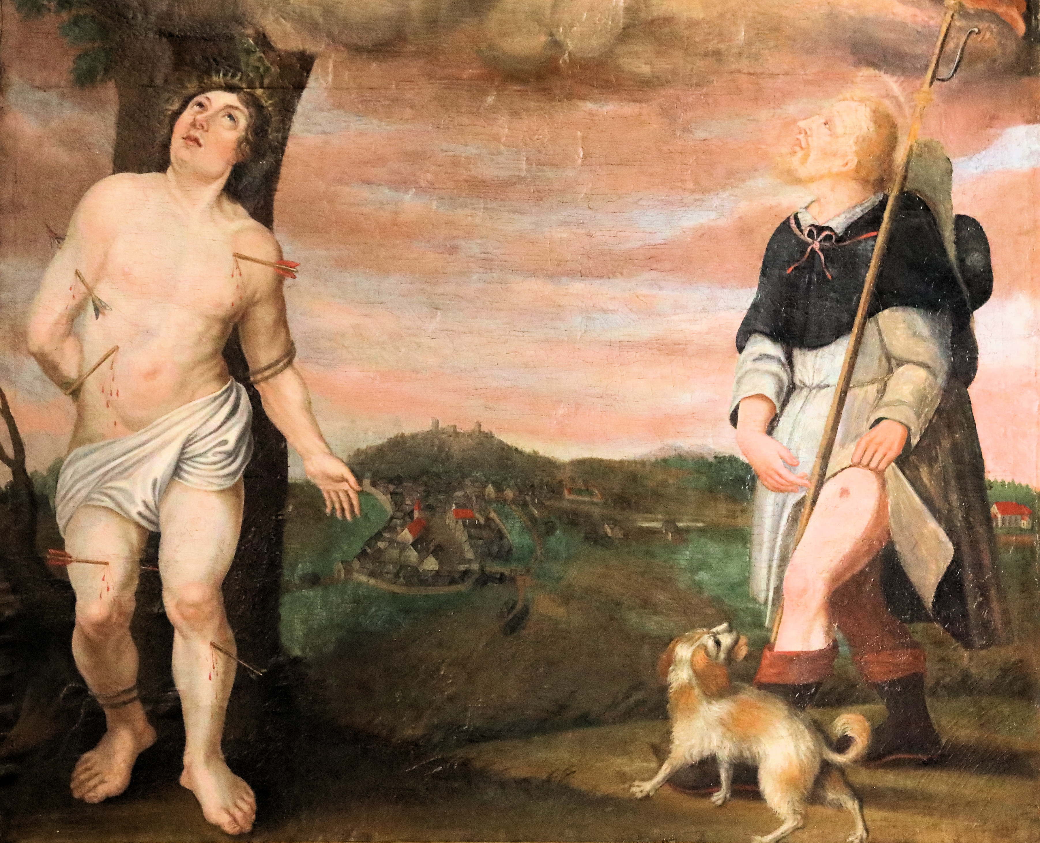 Darstellung des Marktes Tännesberg auf dem linken Seitenaltar von St. Jodok um 1680 mit den Pestheiligen, links der hl. Sebastian, rechts der hl. Rochus: Tännesberg, Landkreis Neustadt an der Waldnaab (2025);