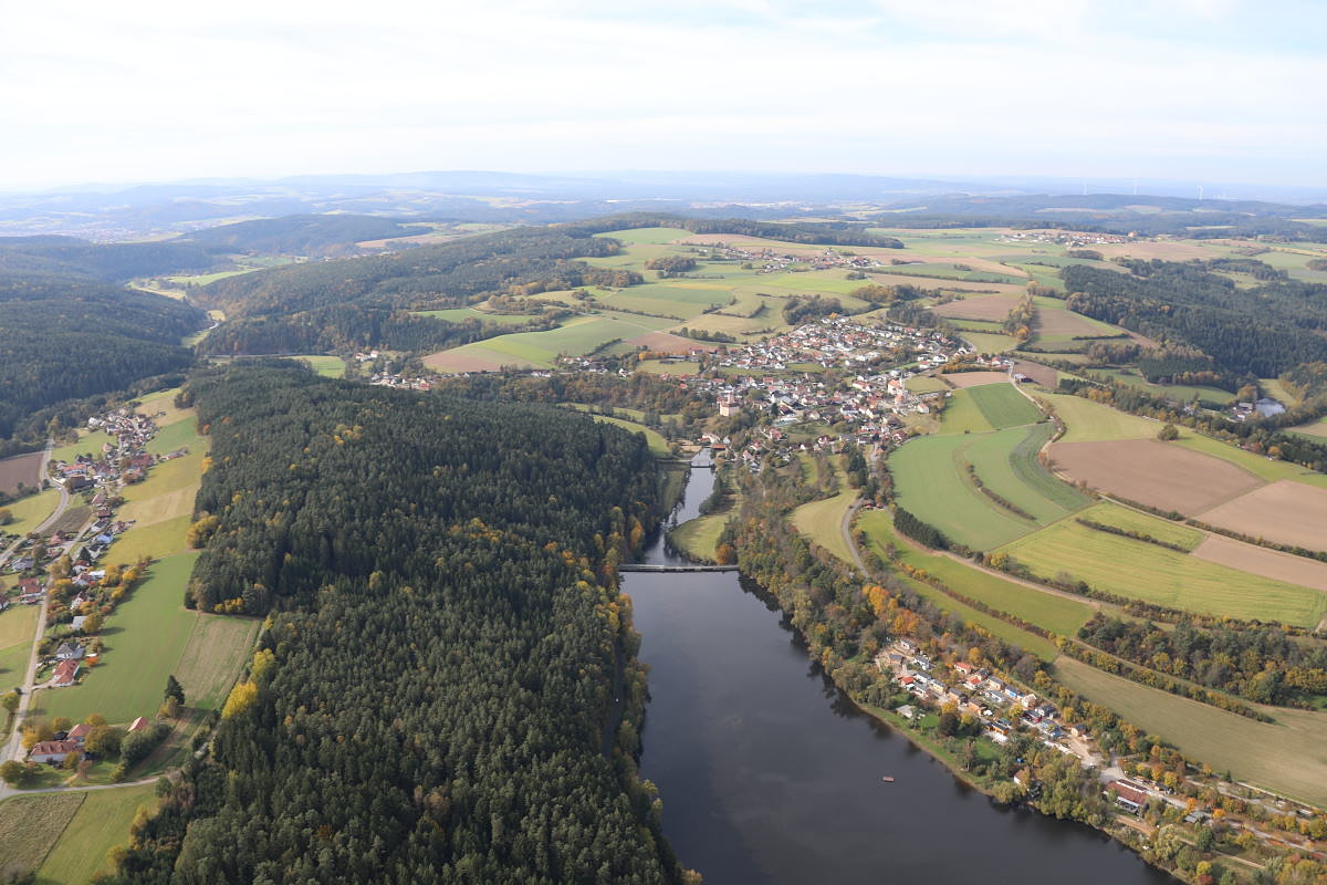 Pfreimdstausee, im Hintergrund Trausnitz (rechts), Atzenhof (links): Gemeinde Trausnitz, Landkreis Schwandorf (2021);