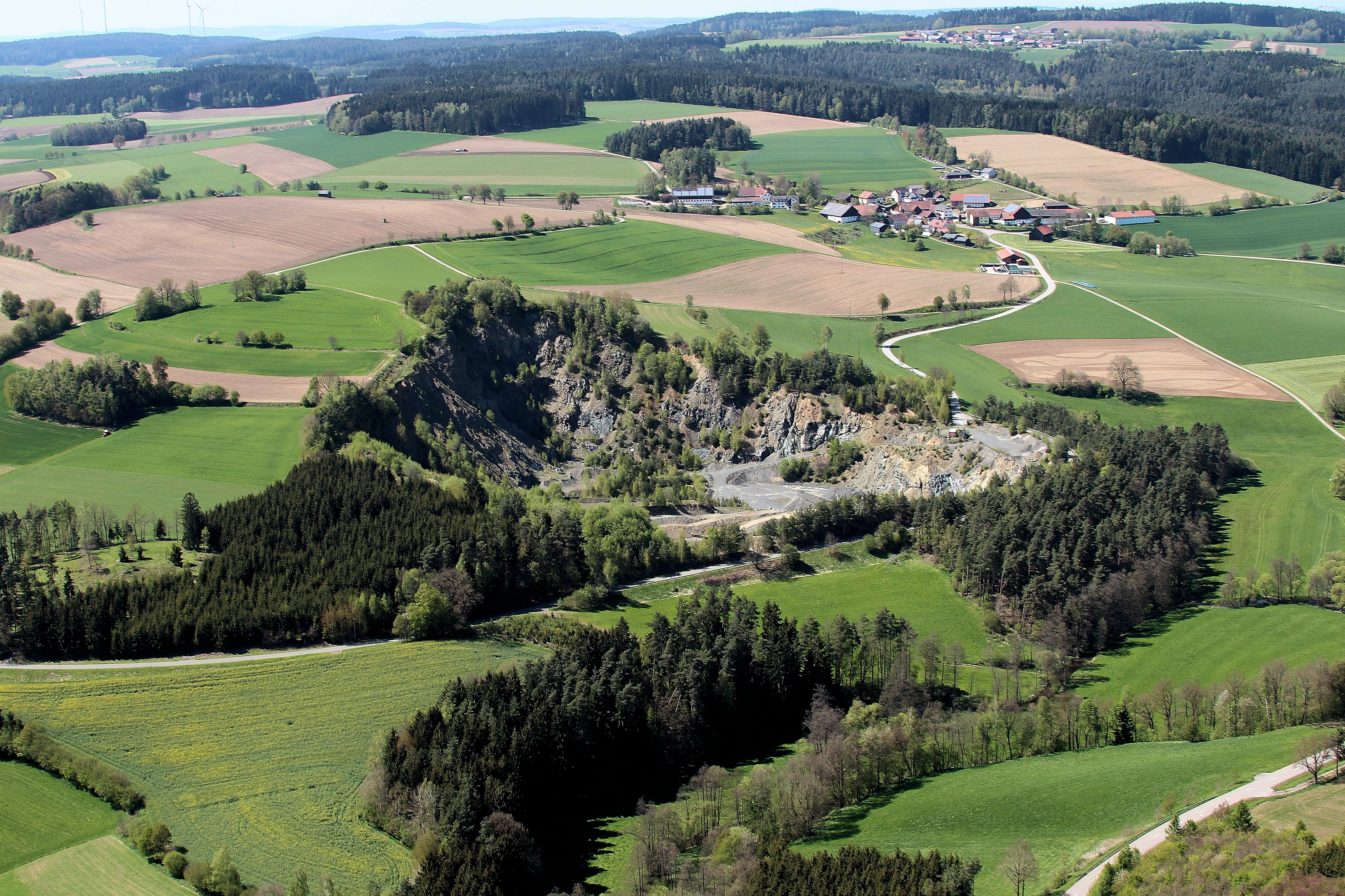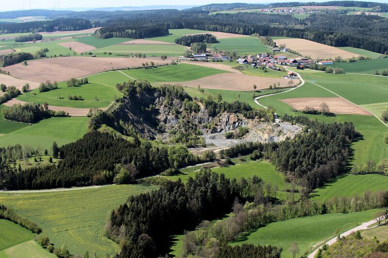 Steinbruch Voggendorf (Bildmitte), Voggendorf im Hintergrund, am oberen Bildrand Schömersdorf (Gemeinde Teunz): Voggendorf, Gemeinde Niedermurach, Landkreis Schwandorf (2017);