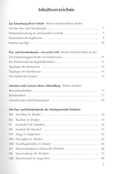 Inhaltsverzeichnis 01: Werner Winderl, Alfons Binder, Annemarie Mösbauer, Andreas Sorgenfrei, Flur- und Kleindenkmale im Bereich der Marktgemeinde Winklarn – Eine Bestandsaufnahme mit Wanderführer, herausgegeben von der Marktgemeinde und der Volksschule Winklarn, Winklarn 2004