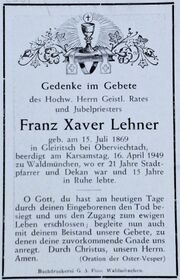 Der in Gleiritsch geborene Franz Xaver Lehner verstarb am 12. April1949 in Waldmünchen und wurde dort am 16. April beigesetzt. In der Priestergruft auf dem Friedhof in Waldmünchen befindet sich eine Gedenktafel, die an den Bischöflich Geistlichen Rat Franz Xaver Lehner erinnert[19]. In den 1950er Jahren wurde in Waldmünchen die "Lehnerstraße" nach dem Geistlichen benannt[20].