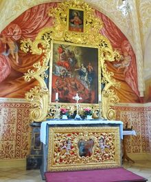 Sie ist ein geschichtliches Kleinod unter den Sakralbauten im Vilstal: Die dem Hl. Laurentius geweihte Allerseelen-Bruderschaftskapelle – so die eigentliche Bezeichnung. Das im gotischen Stil erbaute Kirchlein steht im vorderen Friedhofsbereich. Das gewölbte Untergeschoss der Kapelle diente als Karner (Gebeinhaus). Hier wurden die Knochen von Verstorbenen aufbewahrt, auf die man im beengten Friedhof wegen der kurzen Belegzeiten der Gräber immer wieder gestoßen ist. Die Kapelle selbst mit ihrem markanten Kreuzrippengewölbe wurde um 1300 auf den Karner aufgesetzt. Der kunstvoll geschnitzte Akanthusaltar des Kirchleins findet weithin große Bewunderung, das Rankenwerk im Stil des immergrünen Akanthus ist ein Sinnbild der Unsterblichkeit. Die Bilder und Fresken zeigen thematisch passend die Armen Seelen im Fegefeuer sowie den "Ensdorfer Heiligenhimmel", der die Ordenstradition der Benediktiner darstellt. Auch der Stifter der Armenseelen-Bruderschaft "Landsaß Ritter Michael Amringer zu Bergheim" ist abgebildet. In der ab 1667 angebauten Vorhalle des Kirchleins sind (hinter Schmiedeeisen) der Gegeißelte Heiland, der Hl. Petrus und die Hl. Maria Magdalena dargestellt. Auch ein Holzkreuz mit dem leidenden Christus und eine Muttergottes-Skulptur finden sich hier im Innenbereich. Ein weiterer Anbau bergseits entsteht 1822, nämlich eine Schule mit Mesnerhaus. Dabei wurde die sogenannte Vorhalle des Kirchleins zu einem Bestandteil des Schulgebäudes.